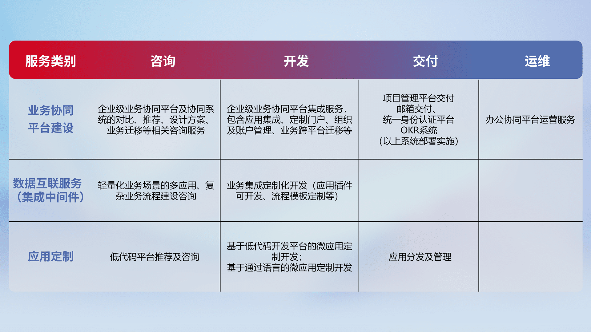 针对钉钉、、、、企微、、IDaas等平台级产品提供产品的规划、、方案、、交付、、、、定制化开发等服务,,,,实现如统一协同办公、、、智能客户服务、、、、混合会议管理、、、、智能数据查询、、、、等业务场景,,实现数字化转型。。。